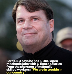 Workers 24 years old and younger are significantly UNDRER represented in skilled trades. Boomers represent a disproportionately high percent of workers in skill trades and jobs requiring apprenticeships. And more than 50 – 77% of employers say they experience ongoing difficulties finding skilled trade workers. With approaching retirement “cliffs” shortages will only get worse. Ford CEO, Jim Farley is right, “We are in trouble in our country.